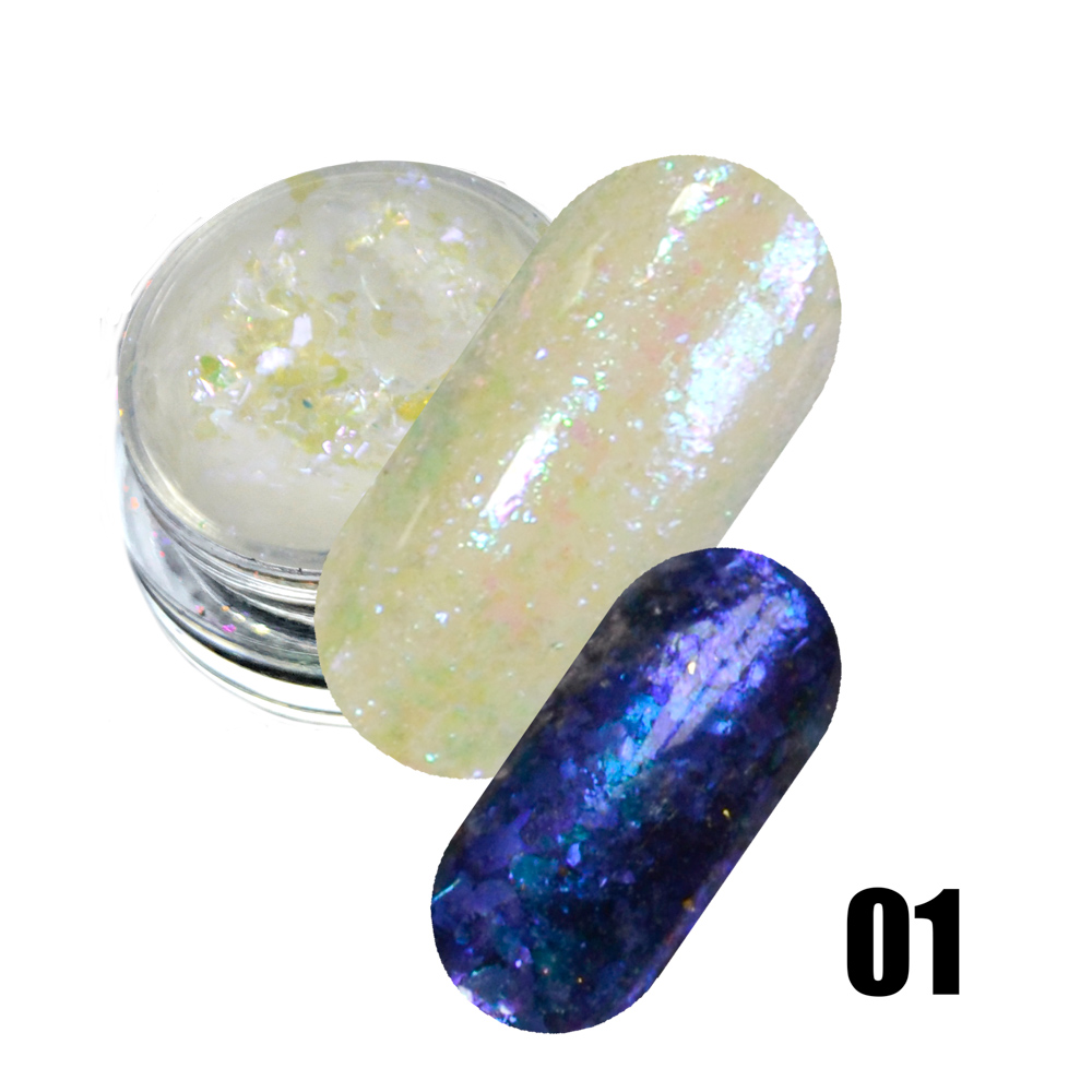 Ніжні пластівці-хамелеони! Неймовірний дизайн та багатогранність кольору. Напівпрозорі відтінки лусочок платинової фольги переливаються різними кольорами.Технологія виконання дуже проста:Нанести базове покриття, просушити.Нанести кольорове покриття, знову просушити.За допомогою кисті, акуртно втоптують рухами нанести пластівці з баночки на липкий шар просушеного кольорового лаку, до бажаного результату.Перекрити фінішним покриттям та просушити в лампі.Ваш манікюр готовий! Насолоджуйтесь красою!