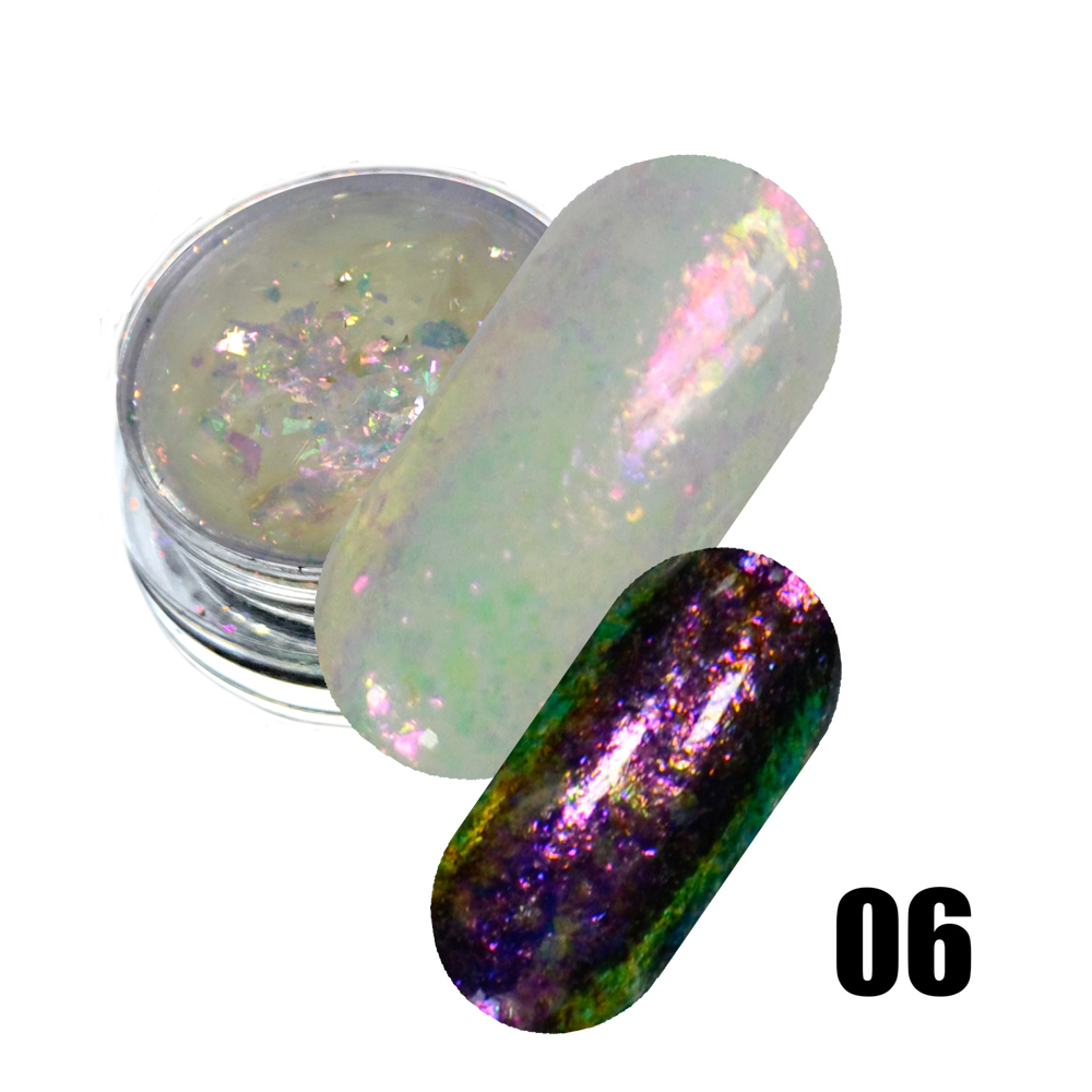 Ніжні пластівці-хамелеони! Неймовірний дизайн та багатогранність кольору. Напівпрозорі відтінки лусочок платинової фольги переливаються різними кольорами.Технологія виконання дуже проста:Нанести базове покриття, просушити.Нанести кольорове покриття, знову просушити.За допомогою кисті, акуртно втоптують рухами нанести пластівці з баночки на липкий шар просушеного кольорового лаку, до бажаного результату.Перекрити фінішним покриттям та просушити в лампі.Ваш манікюр готовий! Насолоджуйтесь красою!