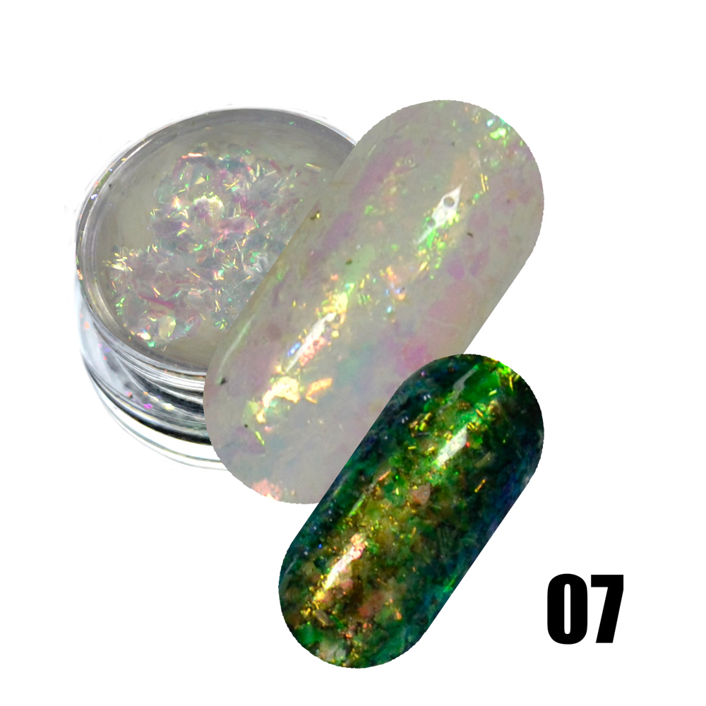 Ніжні пластівці-хамелеони! Неймовірний дизайн та багатогранність кольору. Напівпрозорі відтінки лусочок платинової фольги переливаються різними кольорами.Технологія виконання дуже проста:Нанести базове покриття, просушити.Нанести кольорове покриття, знову просушити.За допомогою кисті, акуртно втоптують рухами нанести пластівці з баночки на липкий шар просушеного кольорового лаку, до бажаного результату.Перекрити фінішним покриттям та просушити в лампі.Ваш манікюр готовий! Насолоджуйтесь красою!